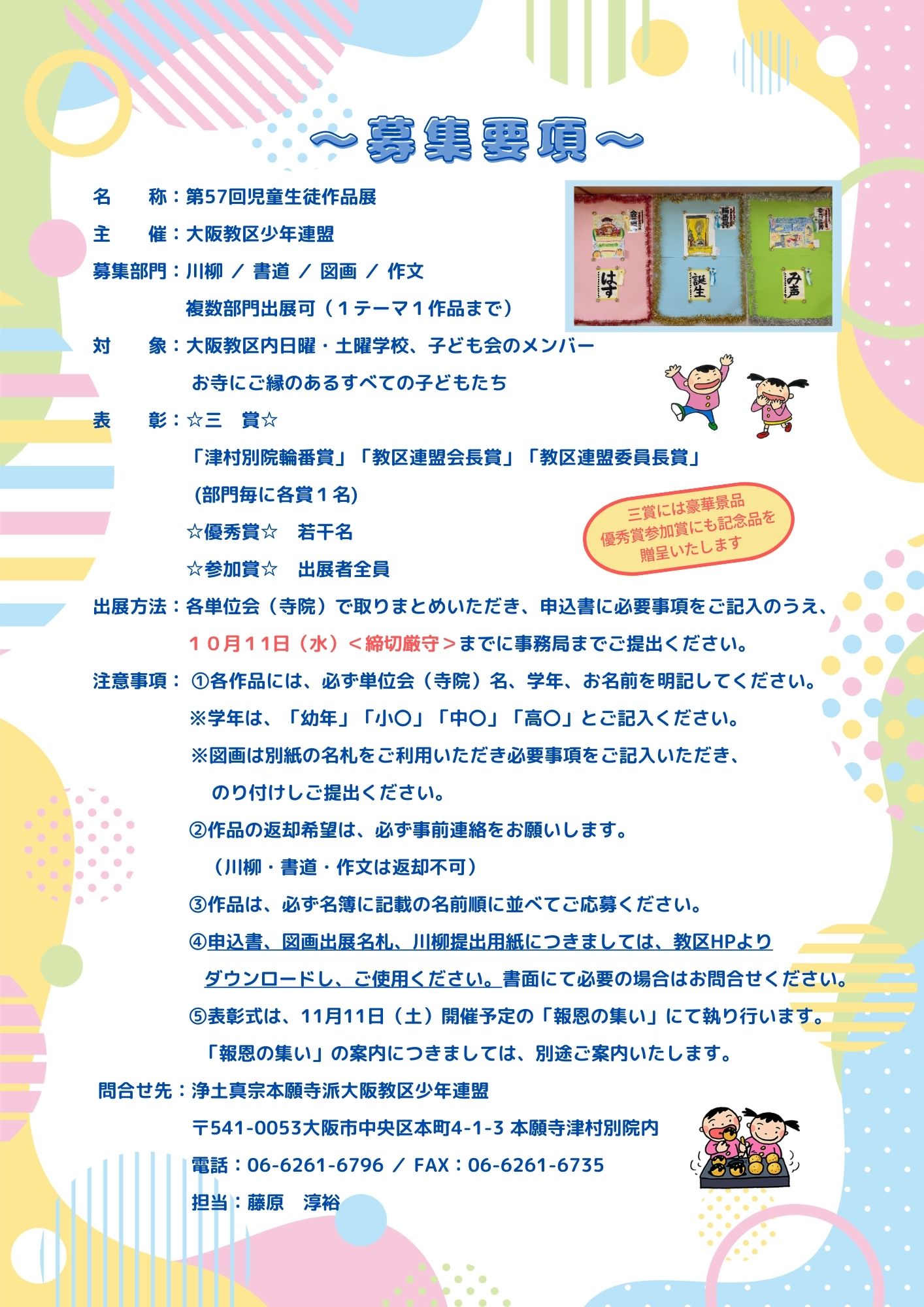 お知らせ トップページ 〉 お知らせ 〉 お知らせ・更新履歴 〉 2023年 〉 第57回児童生徒作品展 第57回児童生徒作品展 作品大募集中!!豪華景品・記念品もご用意しています。 川柳・書道・図画・作文 複数部門の出展も可能です。 以下よりダウンロードください。 申込書 図画出展用名札書式 川柳提出用紙 申込書