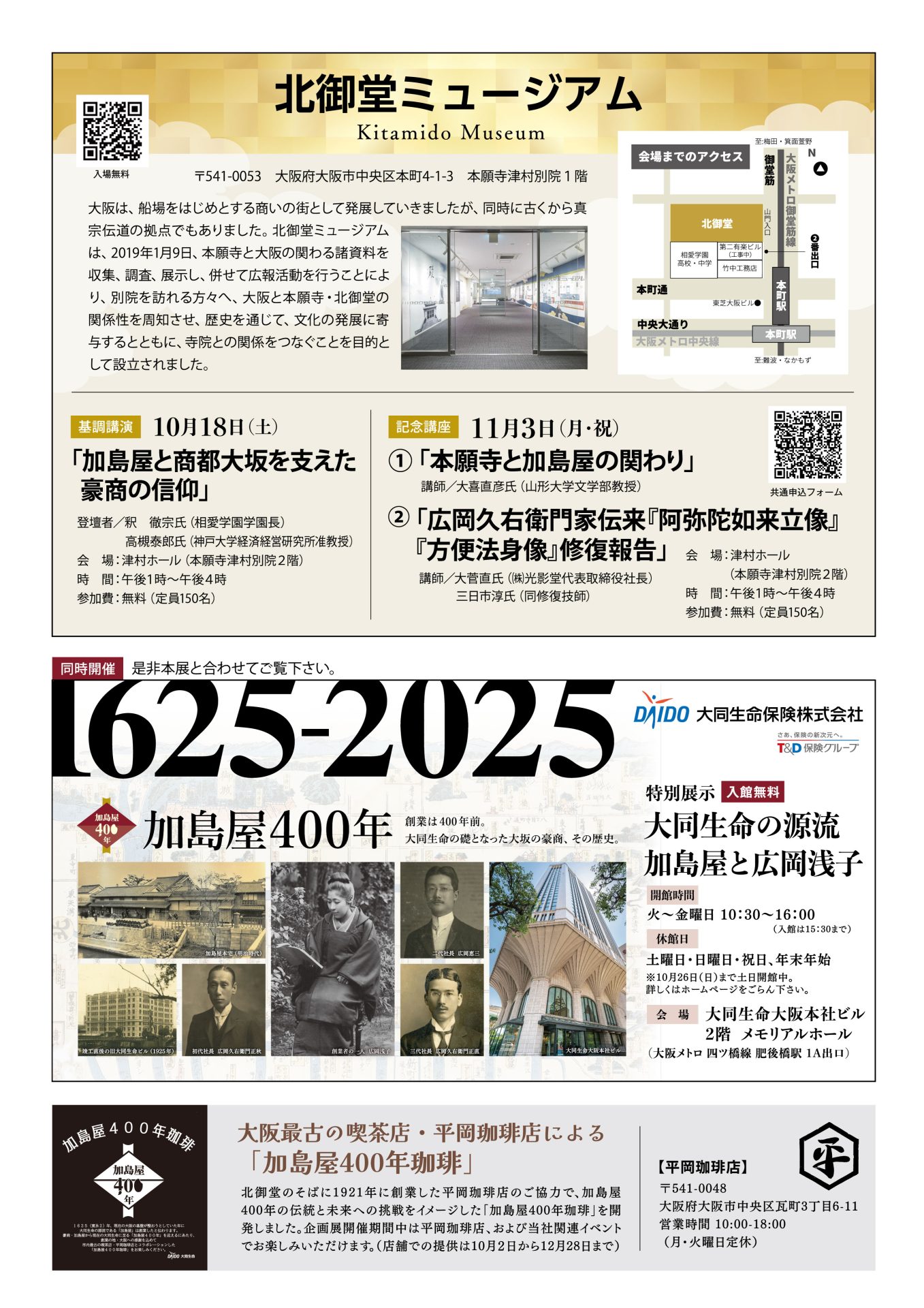 本年が、商都大坂の豪商・加島屋が御堂(現北御堂)前で創業したと伝わる1625年から400年という節目を記念し、特別企画展を開催いたします。