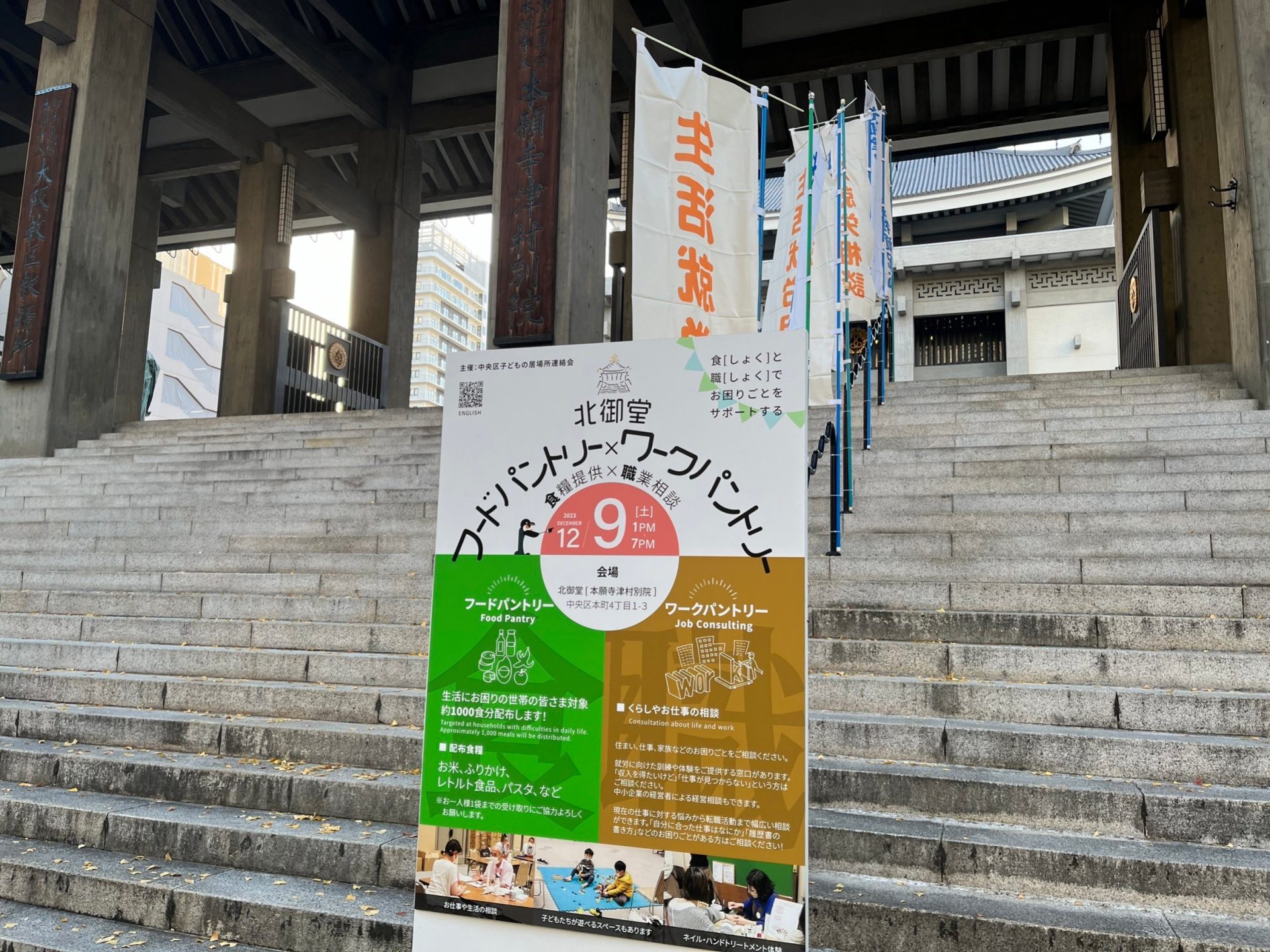 この度、中央区子どもの居場所連絡会主催にて、食(しょく)と職(しょく)のお困りごとをサポートすることを目的とした「北御堂フードパントリー×ワークパントリー」を開催いたします。